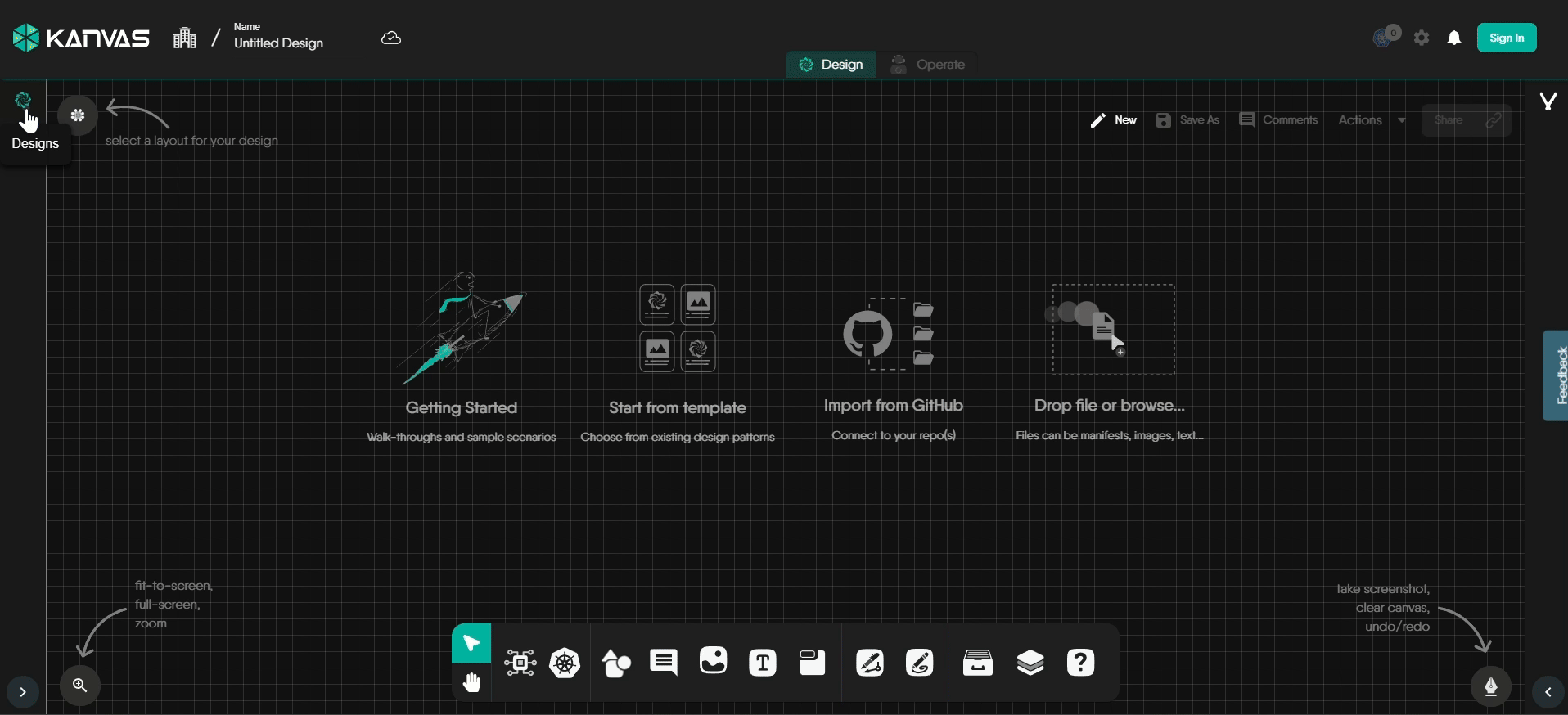 - Open the Designs panel, Select and arrange components from the Designer Dock on the Kanvas, and customize with connections, labels, and properties.
